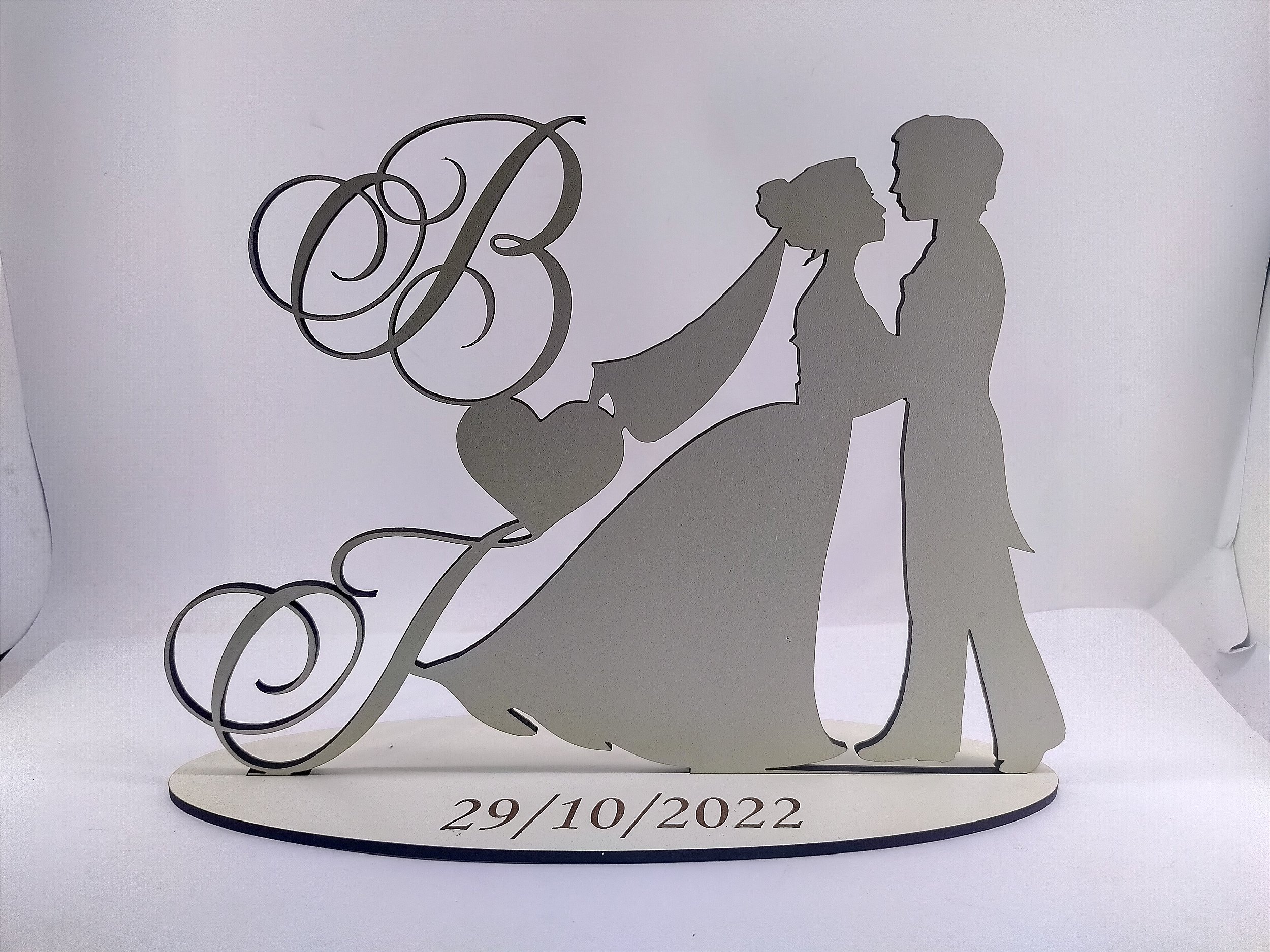 Personalização: recorte a laser das iniciais dos noivos e a data é gravada a laser na base. A personalização a laser é um processo de corrosão no mdf, portanto a gravação ficará amarronzada, e sua tonalidade pode variar de um lote para outro.