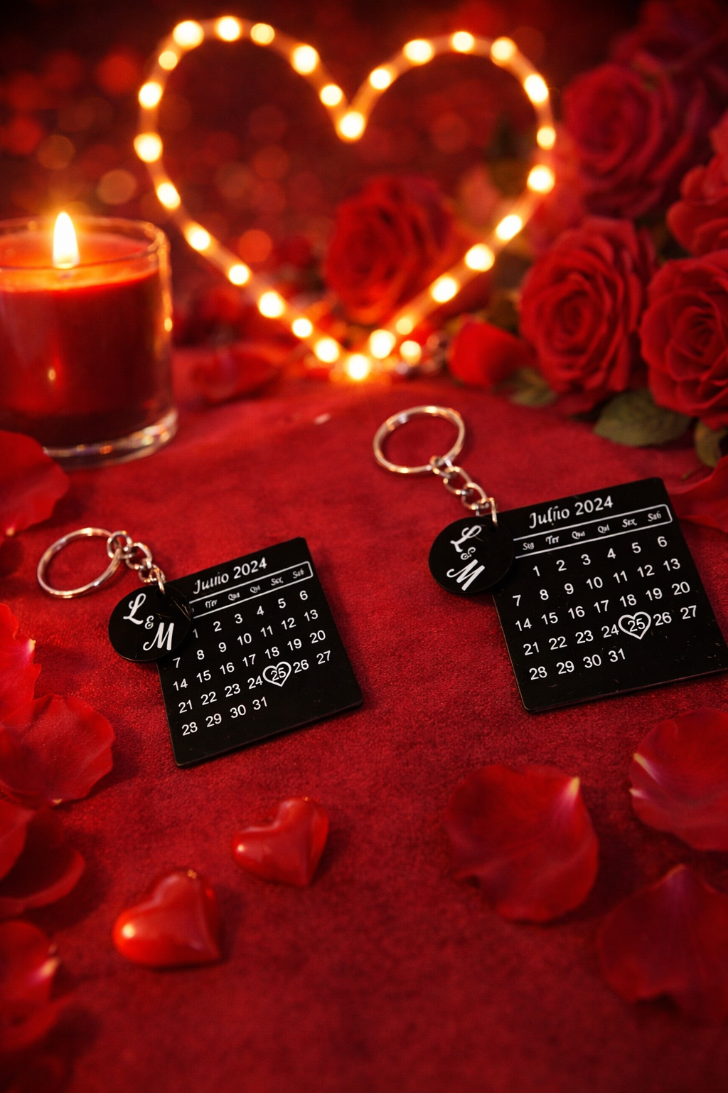 Kit com 2 chaveiros calendário de acrílico, personalizados com as iniciais do casal – perfeito para marcar aquela data especial do namoro de um jeito único e cheio de significado.