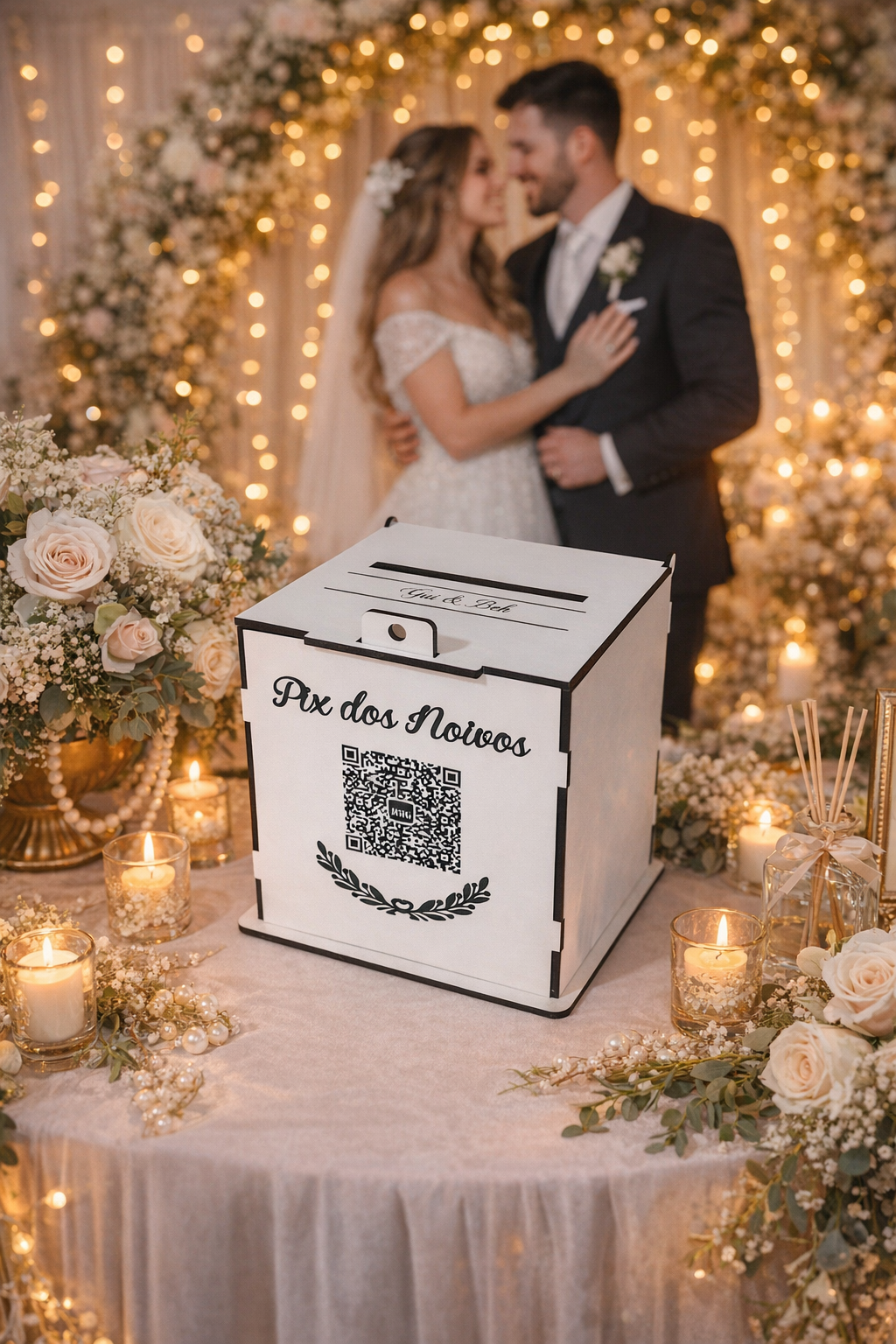 A Urna Cofre Pix dos Noivos é perfeita para receber contribuições via Pix de forma elegante, prática e moderna durante a cerimônia ou festa.